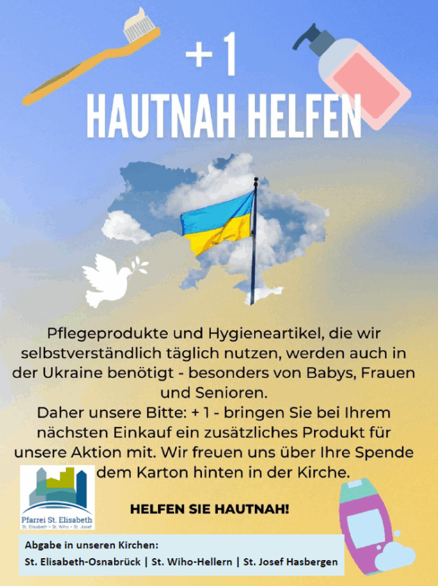 Die Ukraine-Hilfe ist weiterhin aktiv und sammelt weiter: In den Krankenhäusern wird Bettwäsche gebraucht, auch Schlafanzüge, Wäsche und Herrenbekleidung. Auch Pflege- und Hygieneartikel für Babys, Frauen und Senioren werden benötigt (Sammelbehälter stehen in unseren Kirchen).