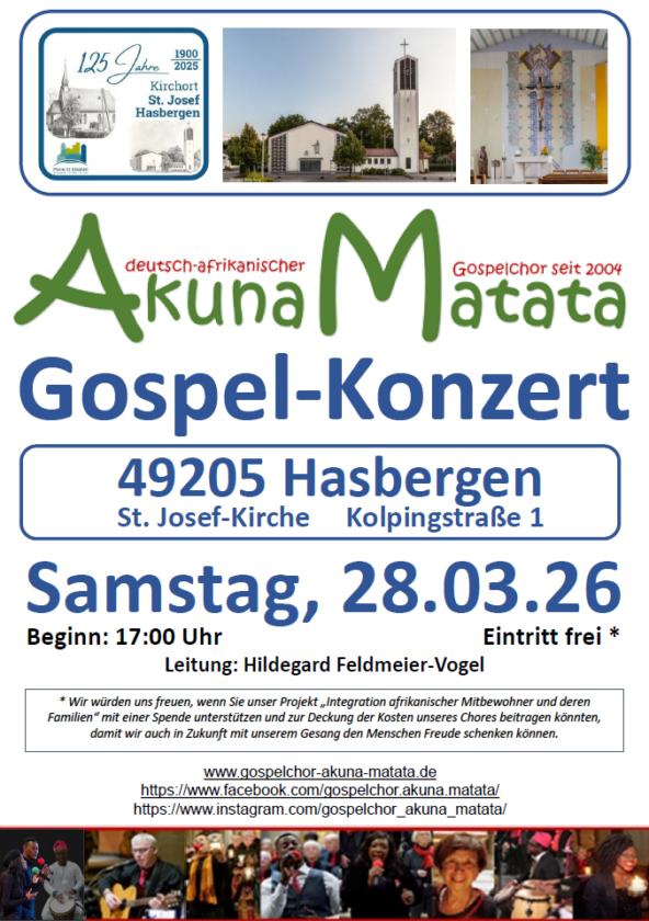 Diesmal singt er im Rahmen des 125-jährigen Kirchort Jubiläums in der Kirche St. Josef Hasbergen am Samstag, 28.3.2026 um 17.00 Uhr.