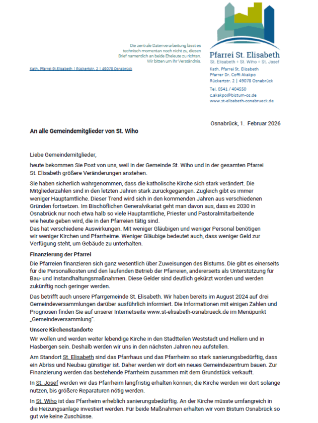 Das Ergebnis der Gemeindeversammlung ist in dem folgenden Brief, der allen Gemeindemitglieder von St. Wiho in den nächsten Tagen auch per Post zugeht, zusammengefasst: