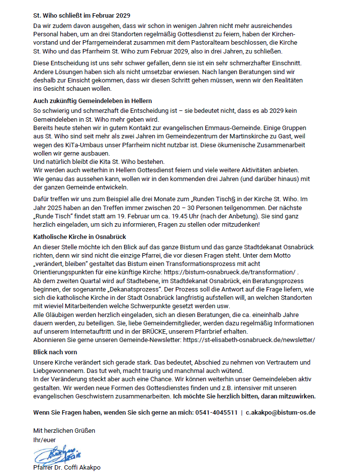 Das Ergebnis der Gemeindeversammlung ist in dem folgenden Brief, der allen Gemeindemitglieder von St. Wiho in den nächsten Tagen auch per Post zugeht, zusammengefasst: