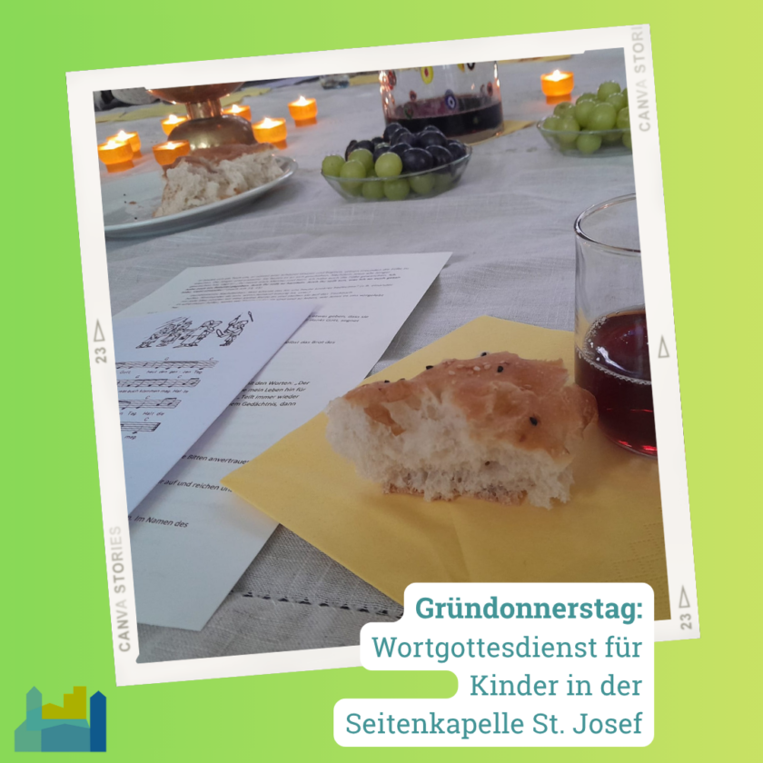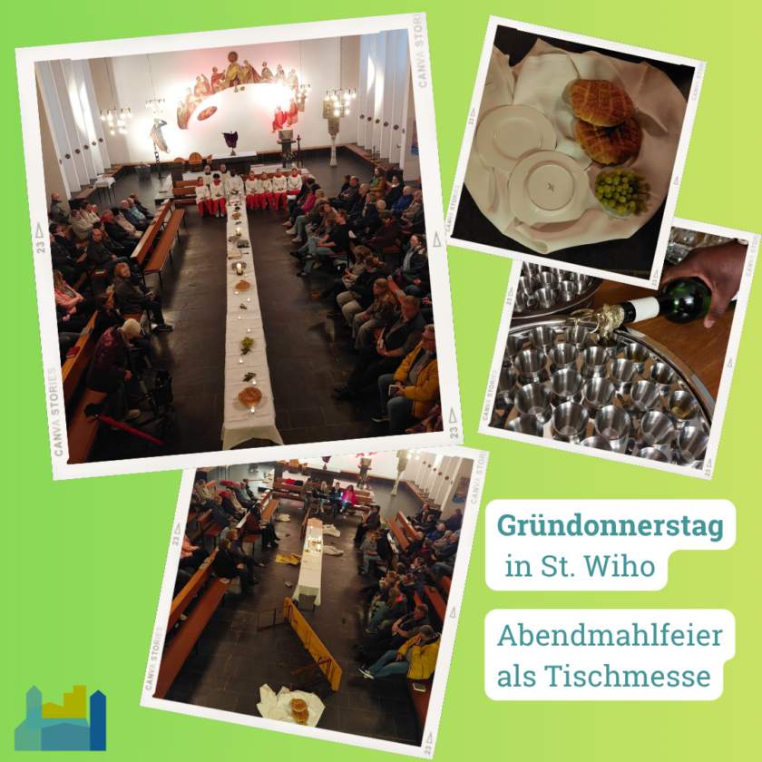 Der Gründonnerstag begann mit einem Wortgottesdienst für Kinder in der Seitenkapelle in St. Josef. Ein echtes Highlight war die Tischmesse in St. Wiho: Durch die umgebauten Kirchenbänke mit Blick auf eine große festlich gedeckte Tafel im Mittelgang und das gemeinsame Abendmahl, bei dem allen Brot und Wein (Leib und Blut Christi) gegeben wurde, war eine ganz besondere gemeinschaftliche Atmosphäre spürbar. Nach dem Abendmahl – in Anlehnung an Jesu Verhaftung und das Ende der Gemeinschaft – wurde der Tisch abgeräumt, Tischdecken wurden weggezogen, Kerzen gelöscht und Bänke umgestoßen.