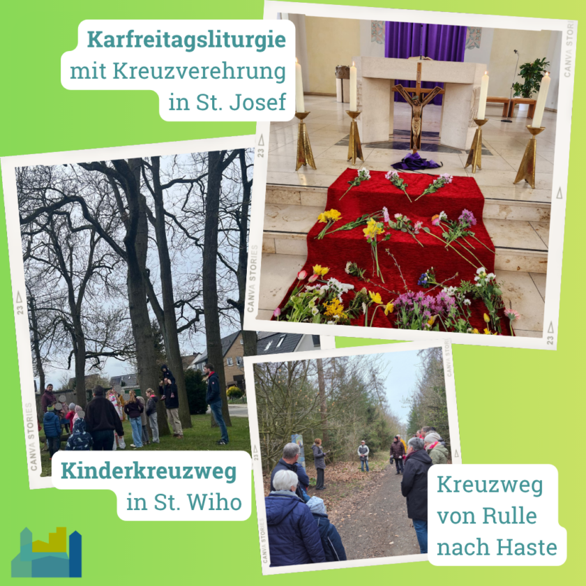 Am Morgen des Karfreitags begaben sich die Kinder auf einen Kreuzweg rund um die Kirche St. Wiho. Die Karfreitagsliturgie, die wir in St. Josef gefeiert haben, war ein besonders stiller und eindrucksvoller Moment in der Karwoche. Im Mittelpunkt stand das Gedenken an das Leiden und Sterben Jesu. Ein berührender Teil war die Kreuzverehrung, bei der jede und jeder nach vorne trat, um das Kreuz zu ehren. Auch in diesem Jahr geschah das auf eine besonders schöne Weise – mit Blumen. So entstand nach und nach ein buntes Zeichen der Hoffnung und des Lebens mitten in der Stille des Karfreitags. Die Kolpingsfamilie Hasbergen bot am Karfreitag abends an, den Kreuzweg von Haste nach Rulle zu gehen.