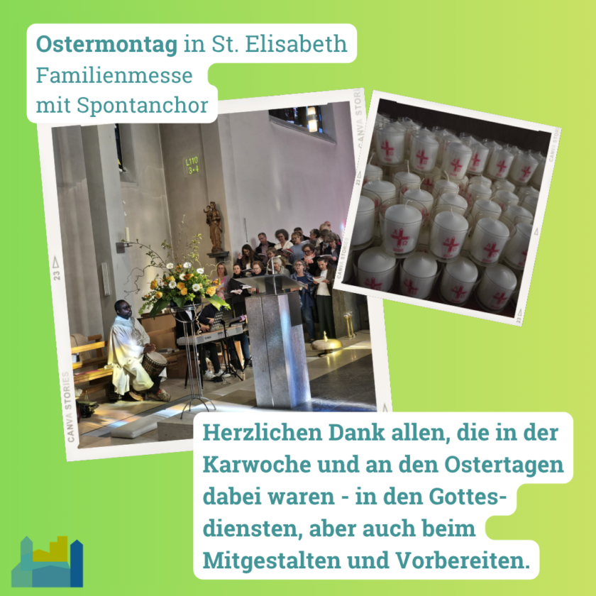 Bevor die österlichen Festtage zu Ende gingen, fand am Ostermontag der Familiengottesdienst in St. Elisabeth statt – unterstützt durch das Vorbereitungsteam der Familienmesse, Kindern der Elisabethschule, dem Spontanchor und den Ministrant:innen. Im Anschluss wurde vor der Kirche zu Kaffee und Getränken – und Ostereiersuchen eingeladen.