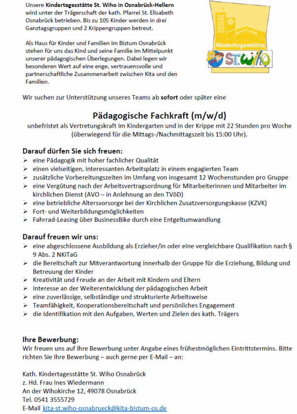 Zur Unterstützung unseres Teams in der KiTa St. Wiho suchen wir