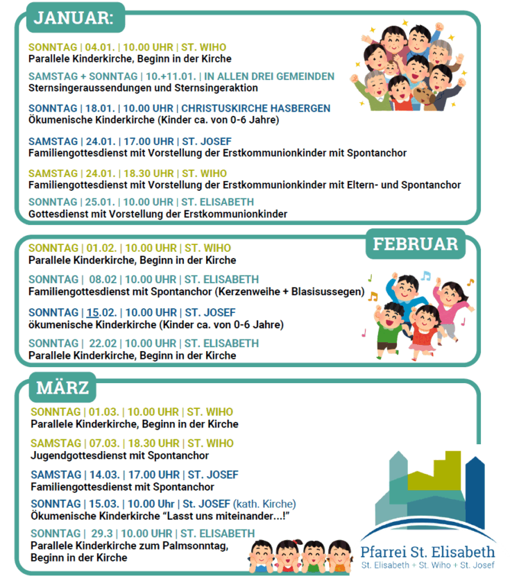 Bei der Parallelen Kinderkirche starten wir immer zusammen mit der Gemeinde in der Kirche, anschließend können kleinere Kinder zu einem eigenen Gottesdienst gehen (in St. Elisabeth ins Gemeindehaus, in St. Wiho in den Turmraum der Kita) und kommen zum Schluss-Segen zurück in die Kirche.