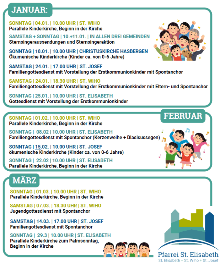 Bei der Parallelen Kinderkirche starten wir immer zusammen mit der Gemeinde in der Kirche, anschließend können kleinere Kinder zu einem eigenen Gottesdienst gehen (in St. Elisabeth ins Gemeindehaus, in St. Wiho in den Turmraum der Kita) und kommen zum Schluss-Segen zurück in die Kirche.